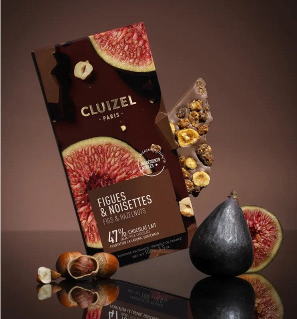 - Tablette chocolat figue & noisette : Chocolat lait 47 % La Laguna, figues confites et noisettes caramélisées.