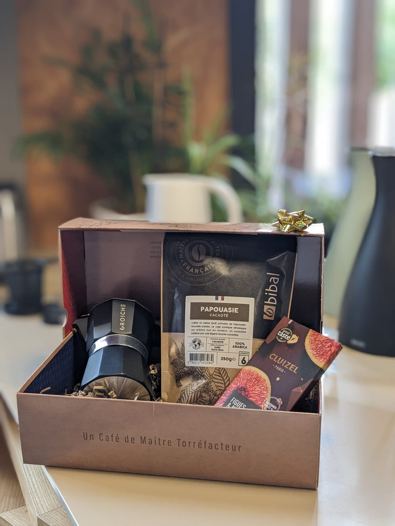 Ce coffret associe un café de caractère, une cafetière italienne élégante et une touche chocolatée gourmande pour une pause café d’exception.