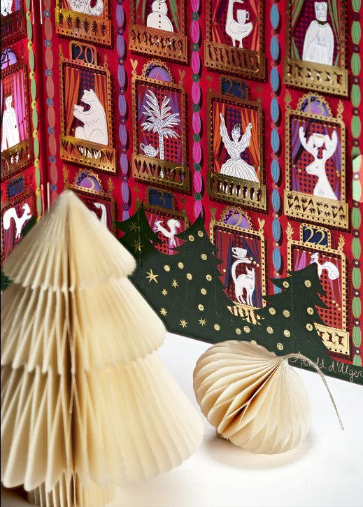 Ce calendrier unique est le fruit d’une collaboration avec le designer et céramiste Arnold d’Alger, fondateur du Bazar d’Alger. Son univers lumineux et poétique apporte une touche de magie à cette édition. Le décor illustre un paysage alpin immaculé, rehaussé d’une forêt de sapins scintillants d’or. Au cœur de la scène, un hôtel de style palace ancien dévoile, case après case, des personnages malicieux et un intérieur richement coloré, pour un véritable voyage visuel tout au long de l’Avent.